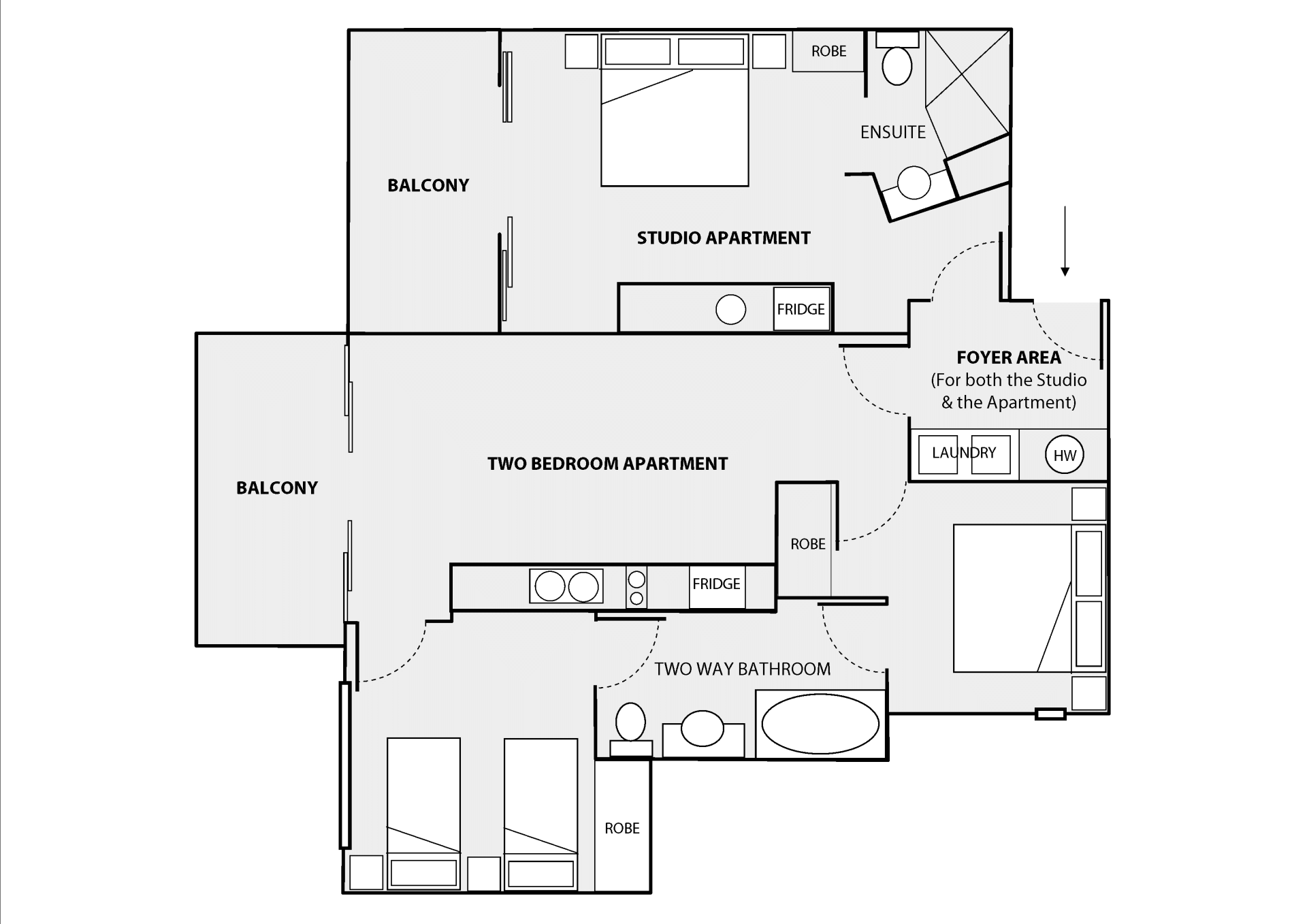 1. A 3 bedroom, 2 bathroom dual key apartment on the top floor rented through resort