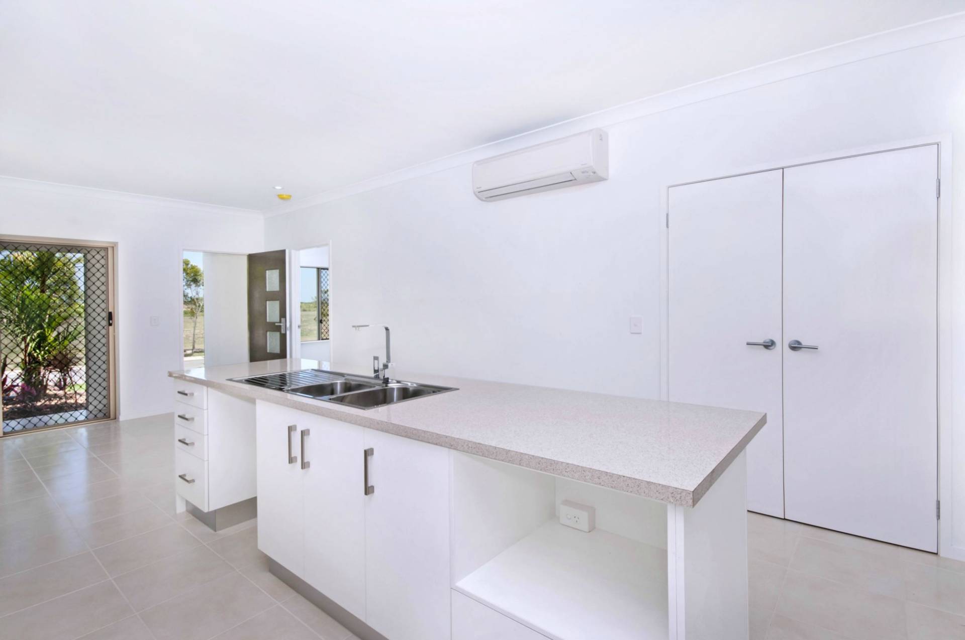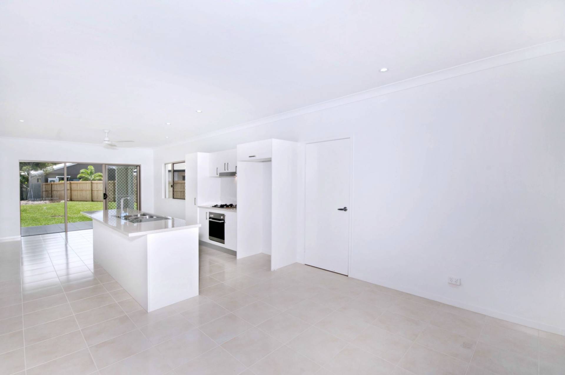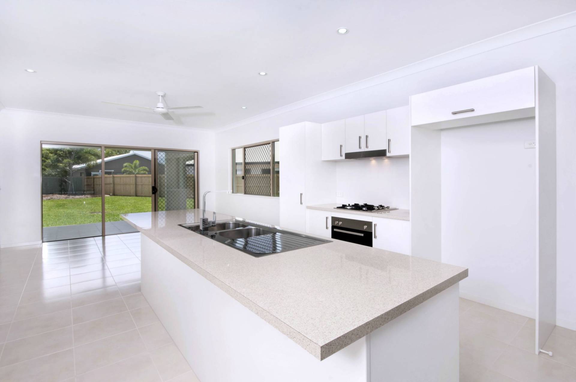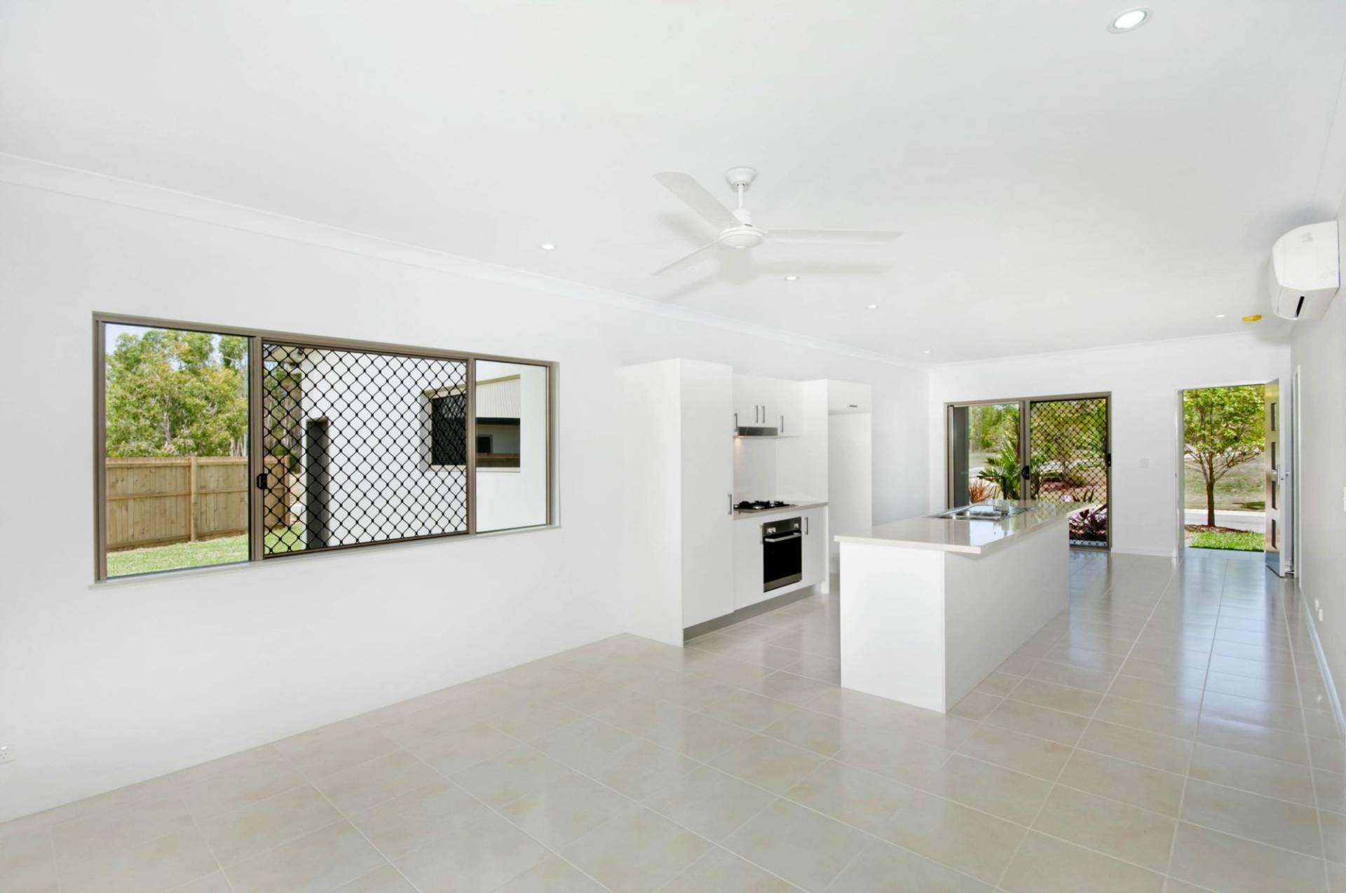 * Walk-through kitchen with island bench between the living and dining areas