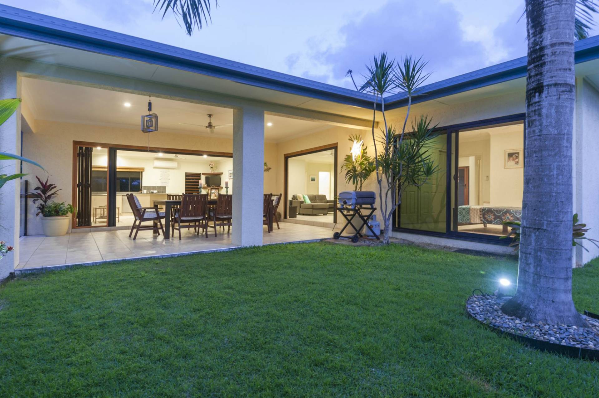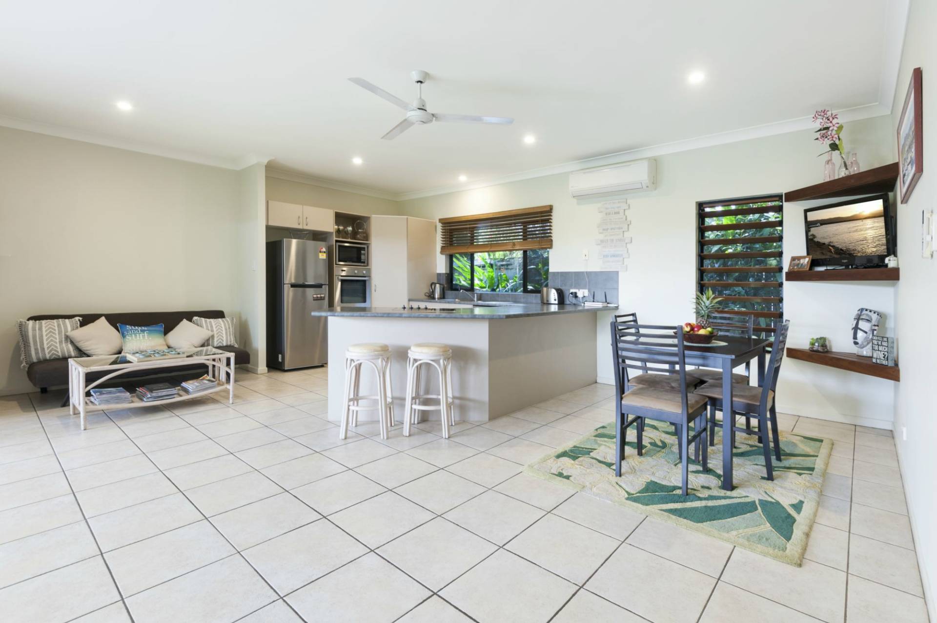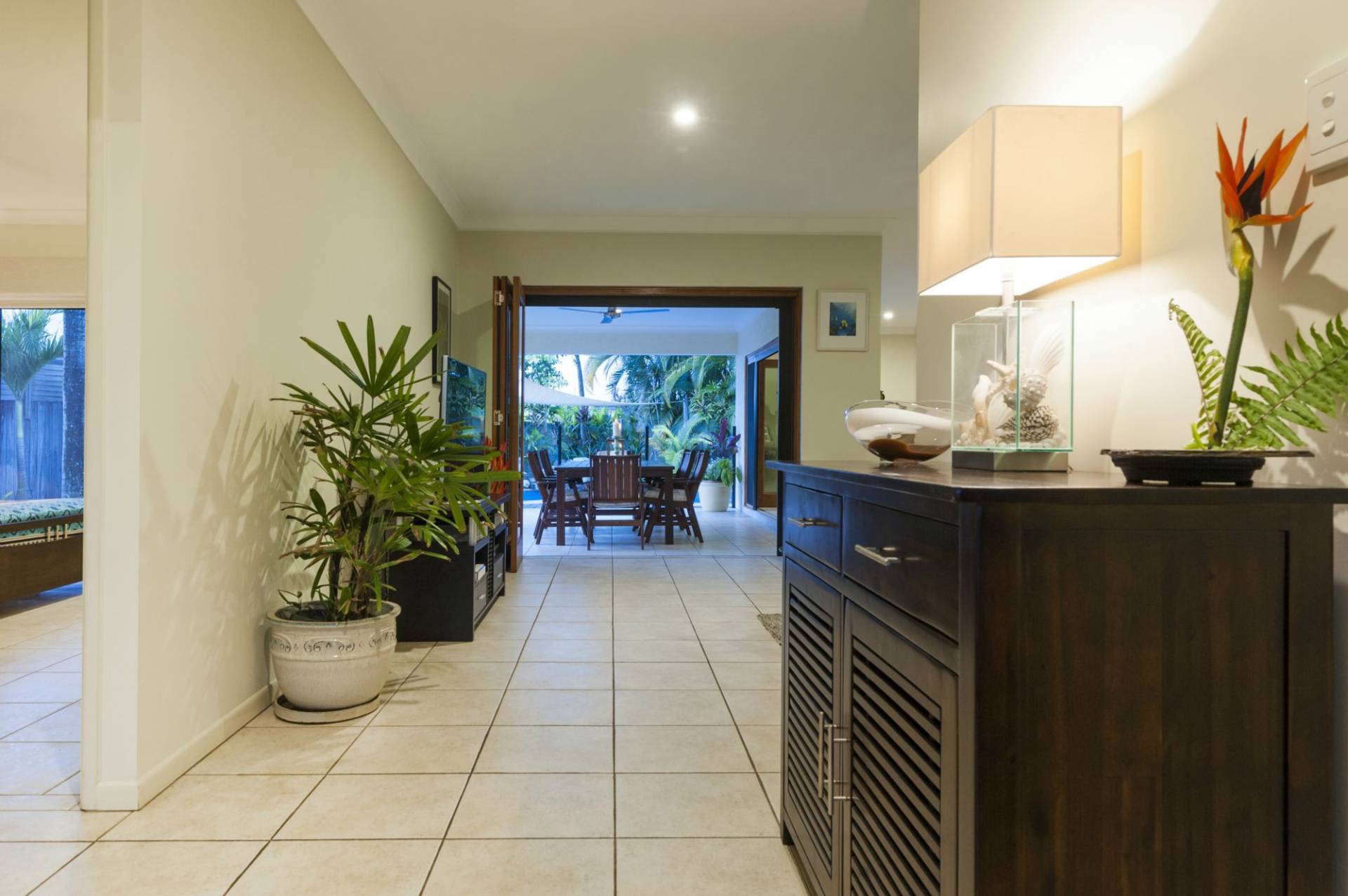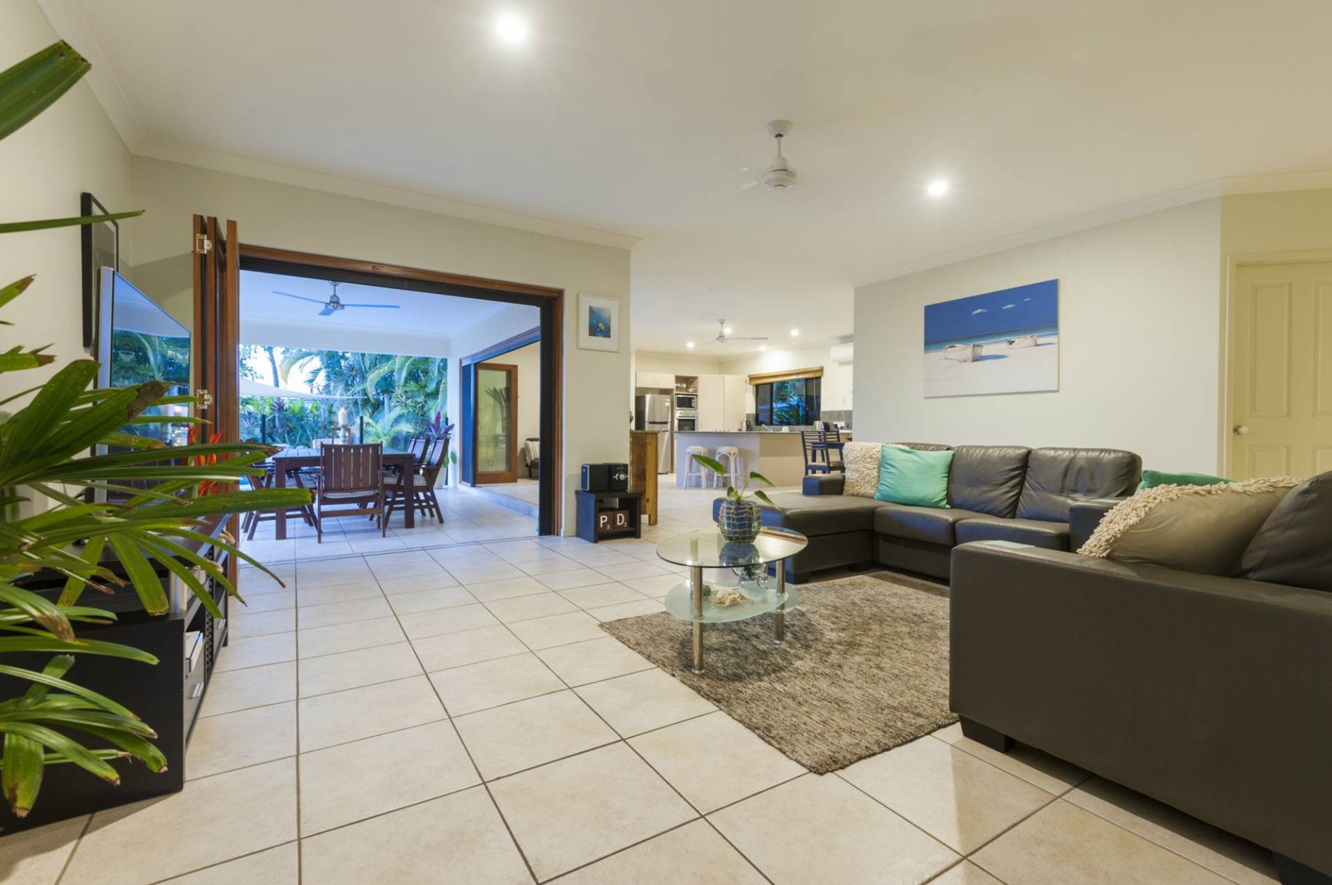 The open flow of the living areas, dining, kitchen and large alfresco entertaining area is awesome. Improved and perfect for the tropics with top quality timber bi-fold doors and retractable screens.