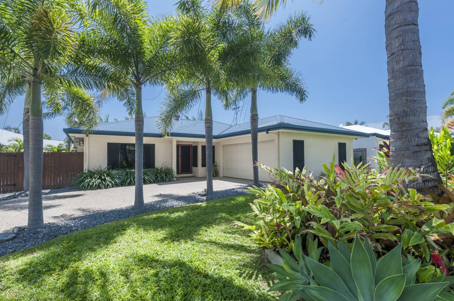The design has also allowed the garage to be orientated to the side allowing for a curved driveway that becomes a feature lined with palms. There is a large additional side access and gates ideal for the boat, trailer & caravan parking.