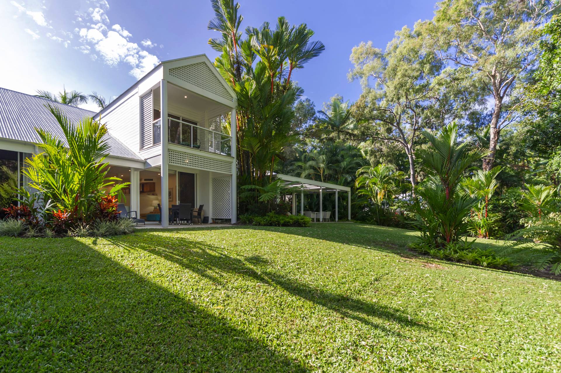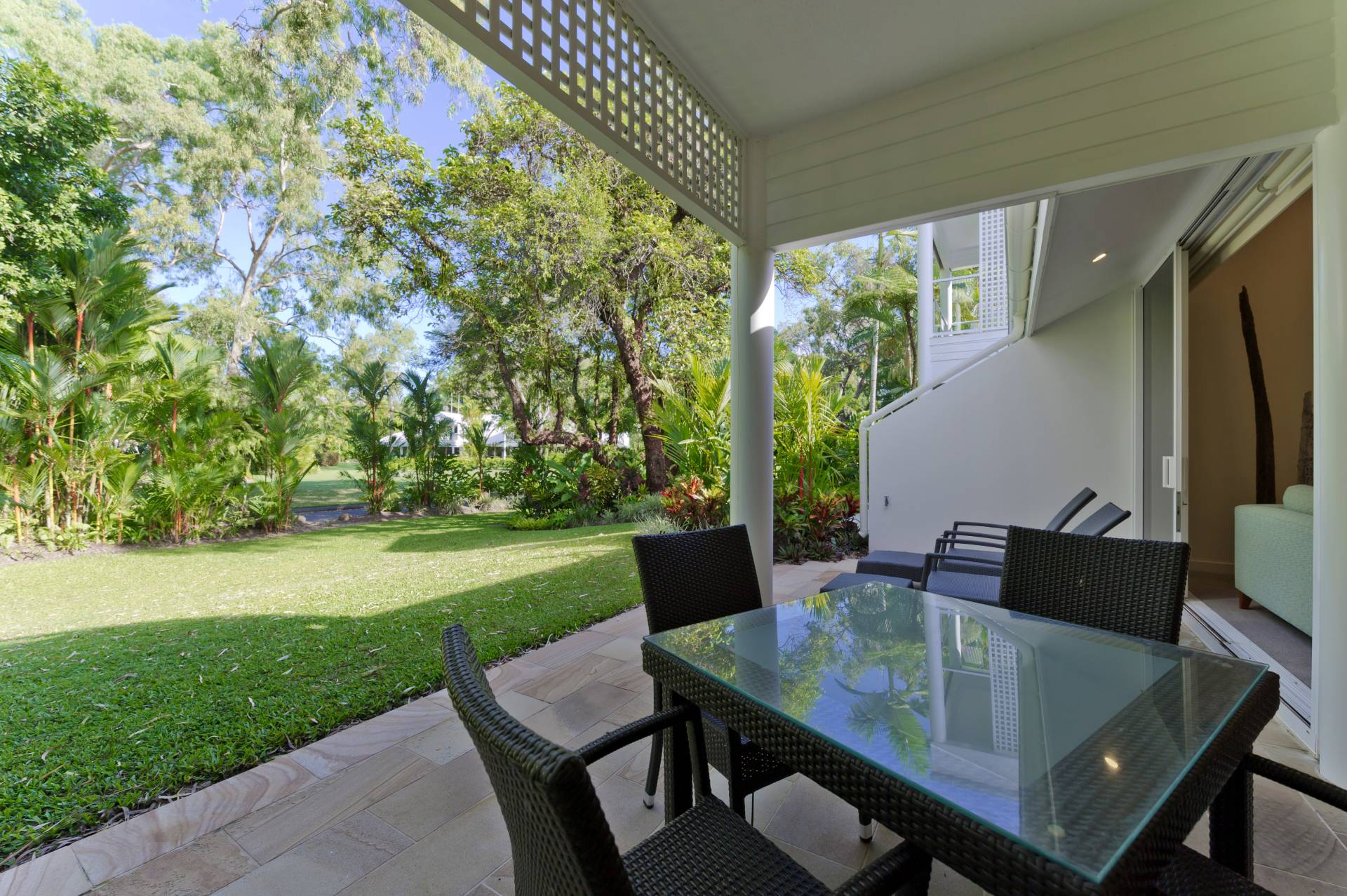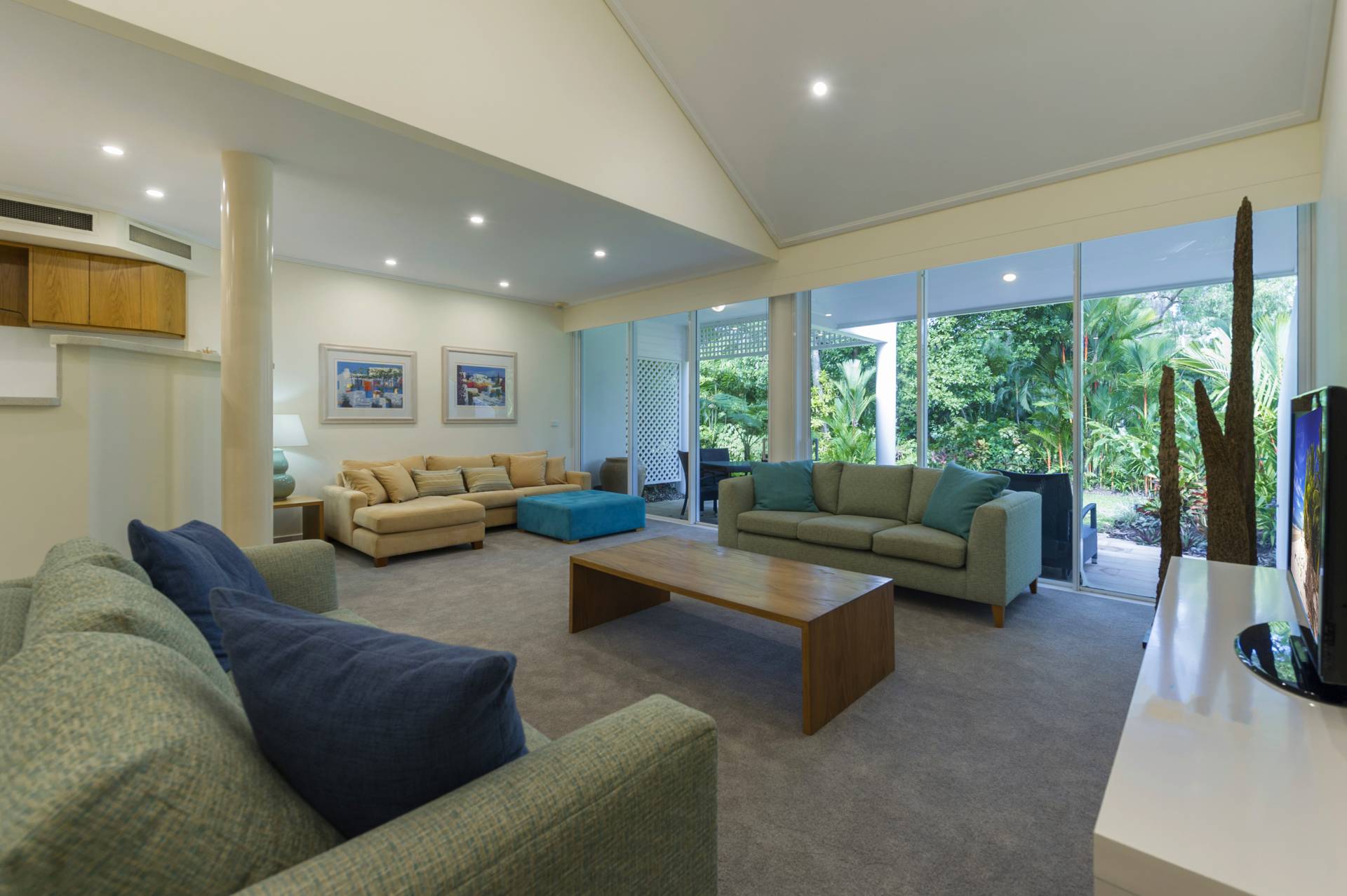 From the lounge the east facing wall opens up almost completely providing entry for the refreshing southeasterly Coral Sea breeze and direct access to the established, luscious grounds