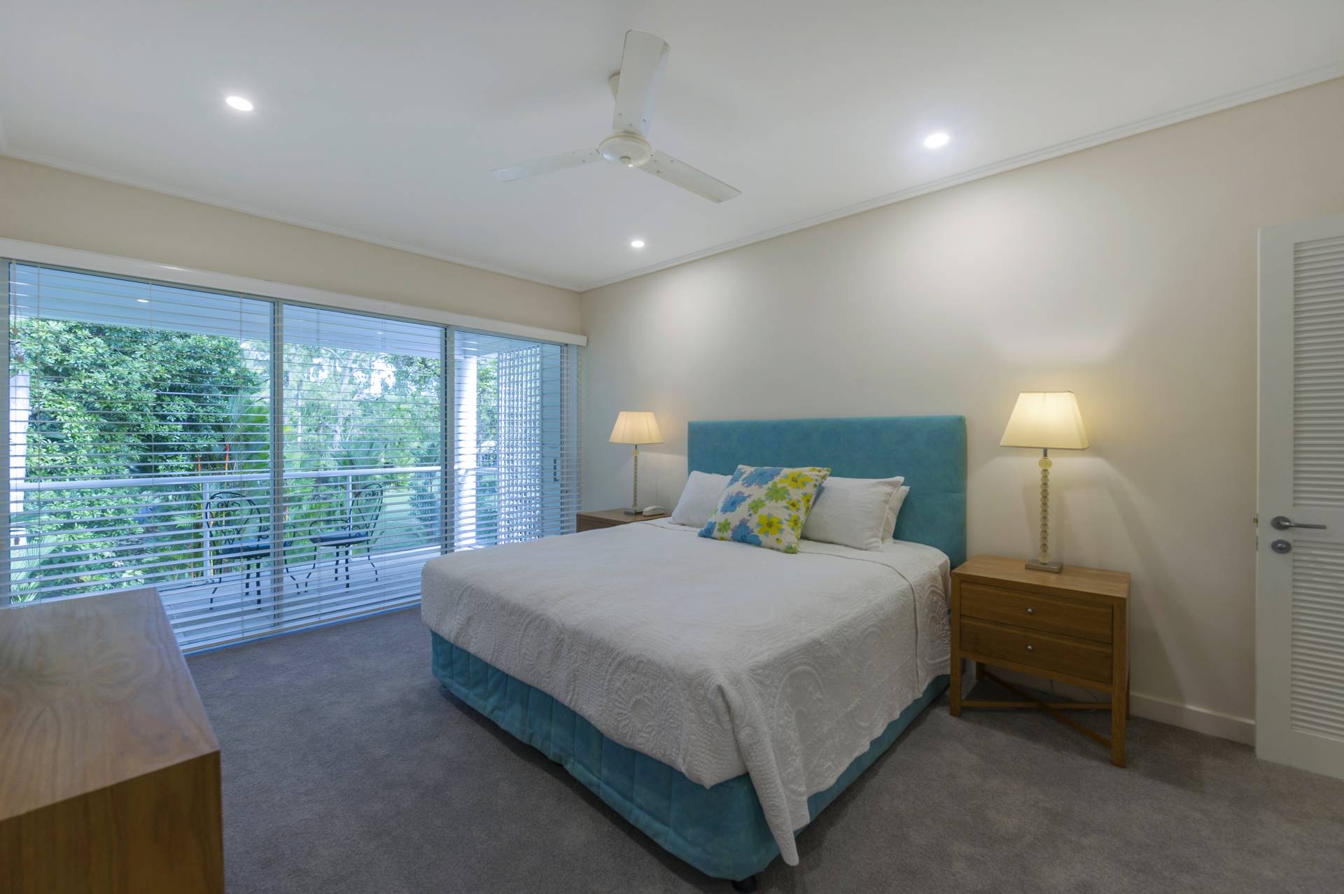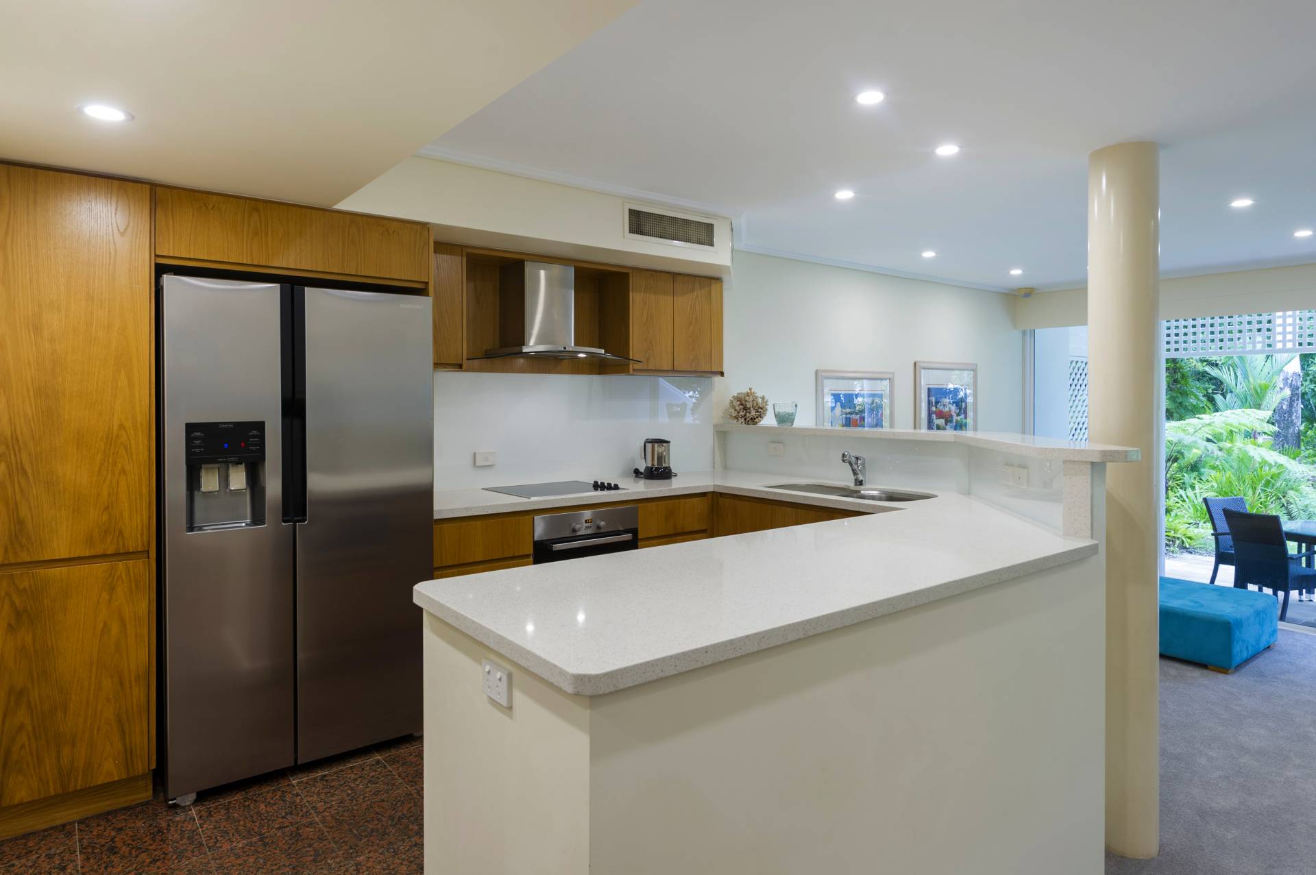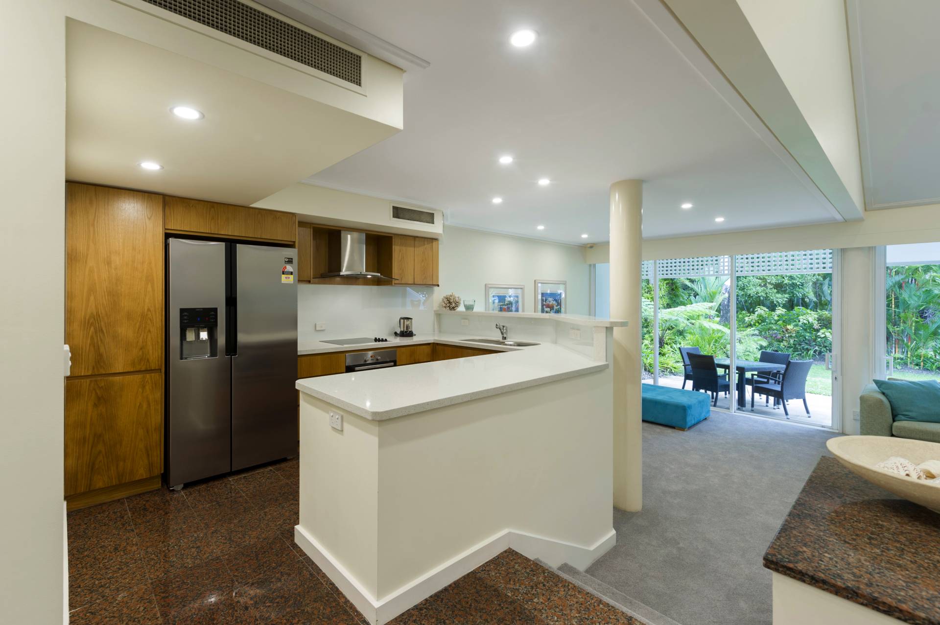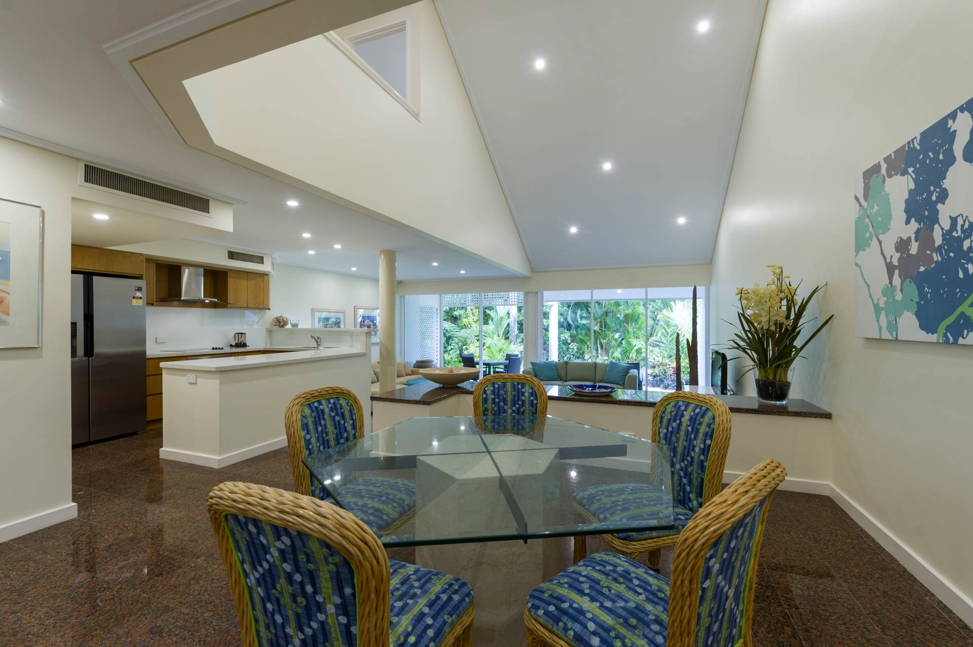 From the lounge the east facing wall opens up almost completely providing entry for the refreshing southeasterly Coral Sea breeze and direct access to the established, luscious grounds