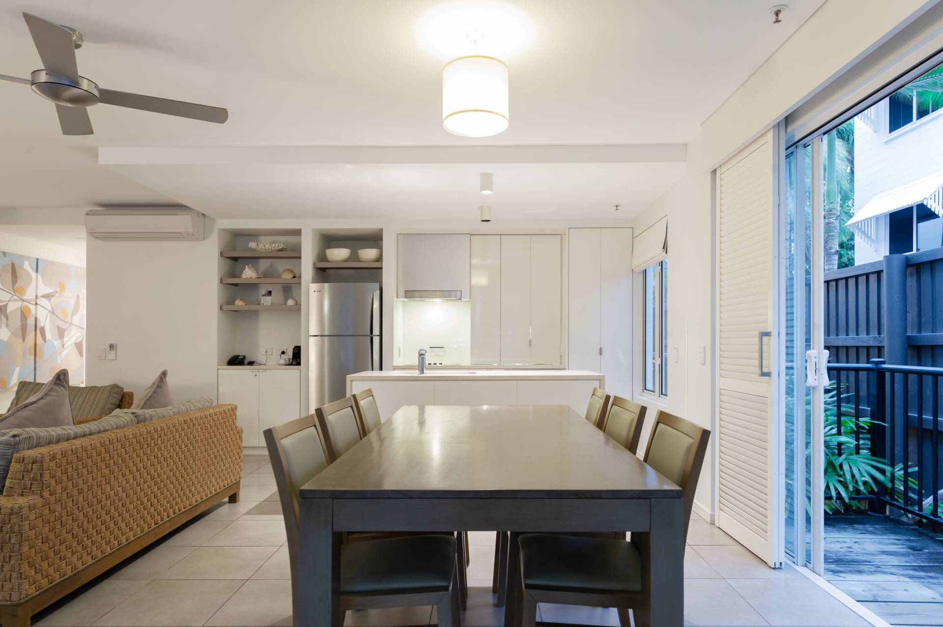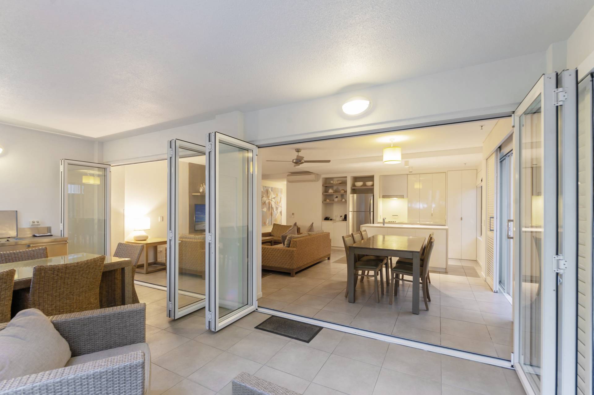 Views flow from the apartment, across the council maintained parkland to the Coral Sea and Fourmile Beach. The south easterly trade winds ensure refreshing sea breezes throughout the year.