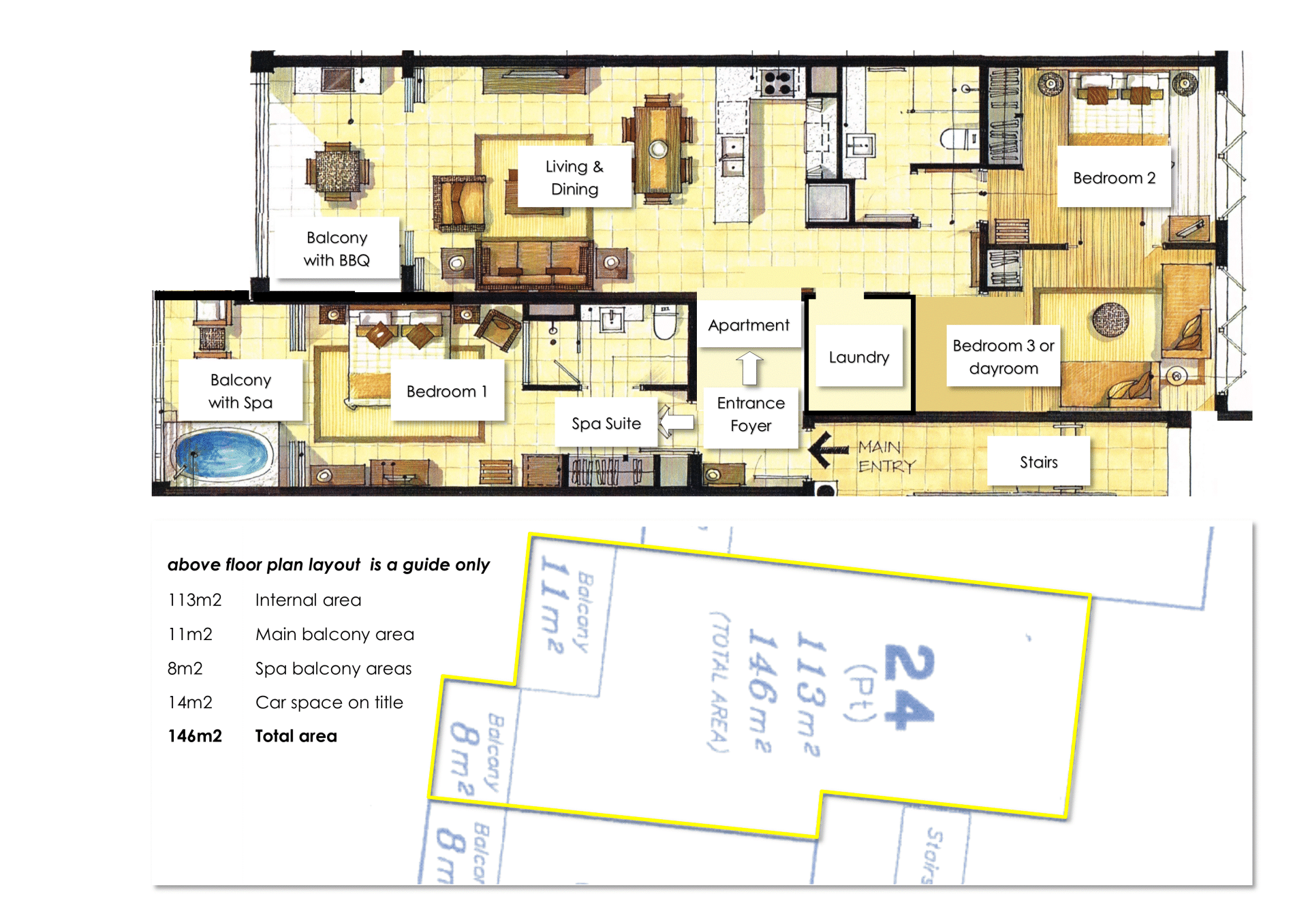 One of the largest apartment types boasting 146m2 on title. Originally sold as a three (3) bedroom, two (2) bathroom dual key apartment. The resort using and advertising the 2nd bedroom of the self-contained apartment as a dayroom.