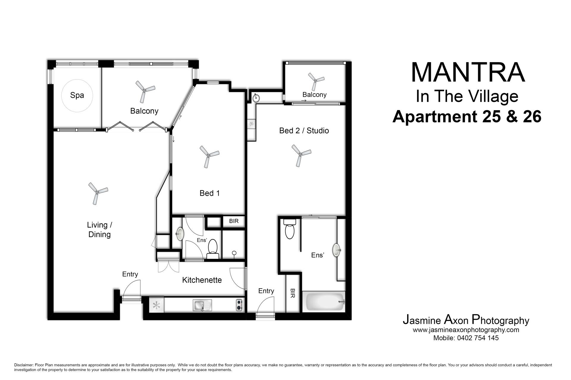 • Apartment 25: self-contained, air-conditioned 85m2 1 bedroom apartment with kitchen, lounge, balcony and large outside spa