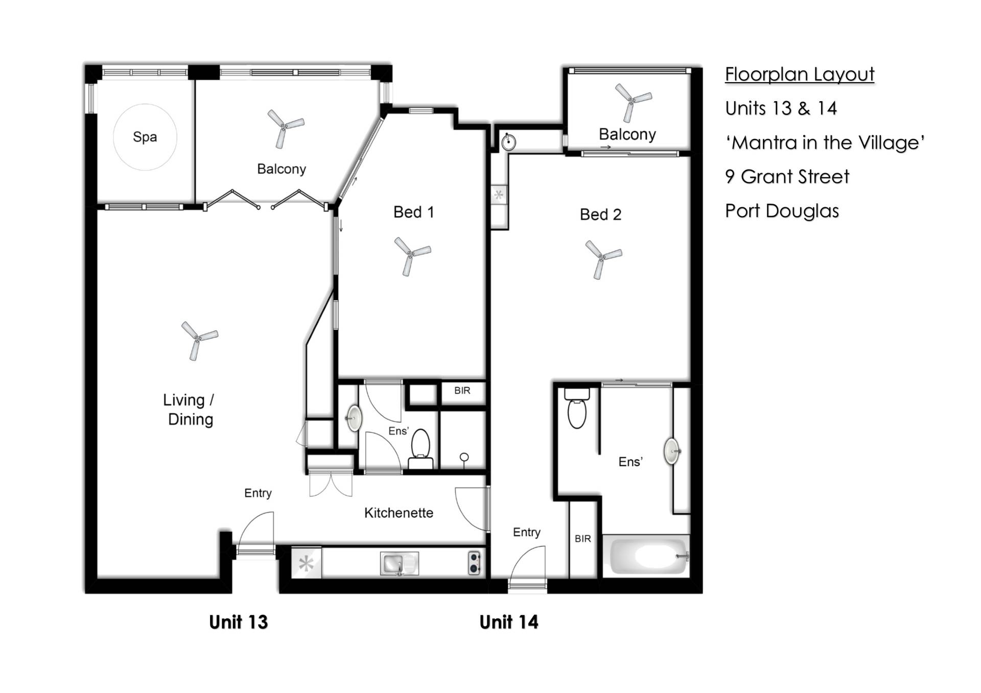 • 85m2 Apartment 13: 1 bedroom with ensuite, full kitchen, lounge room, fully air-conditioning, balcony and large outside spa