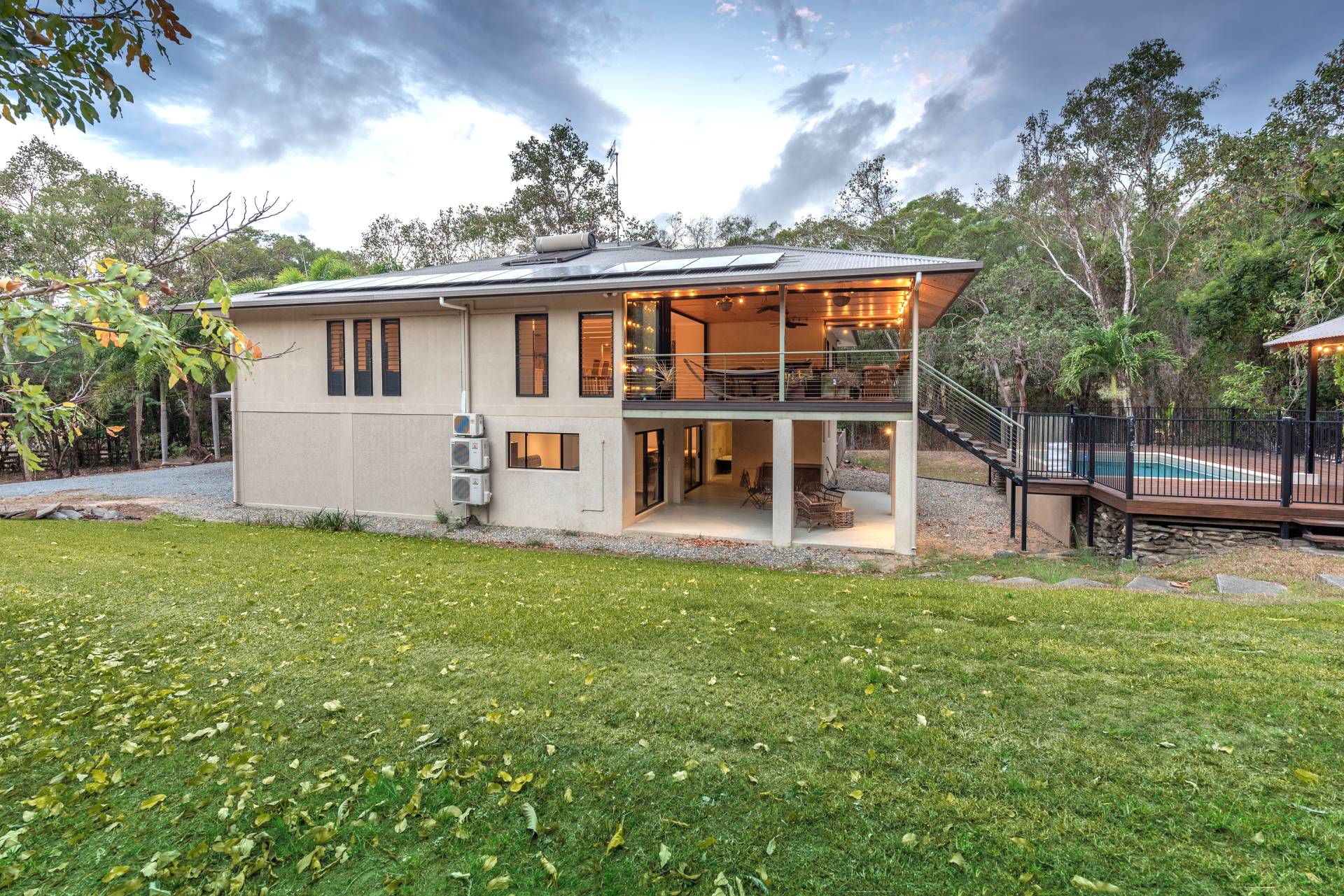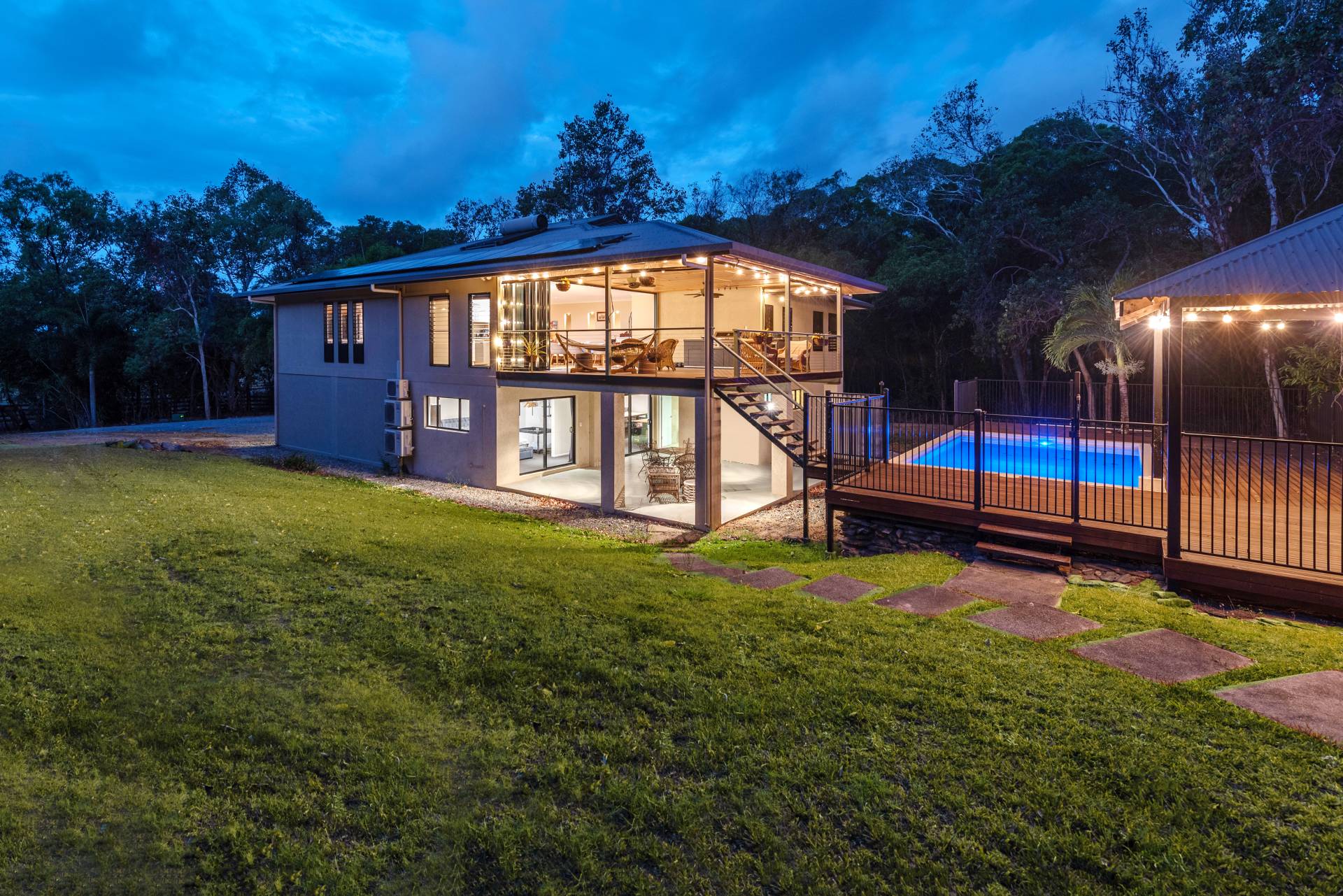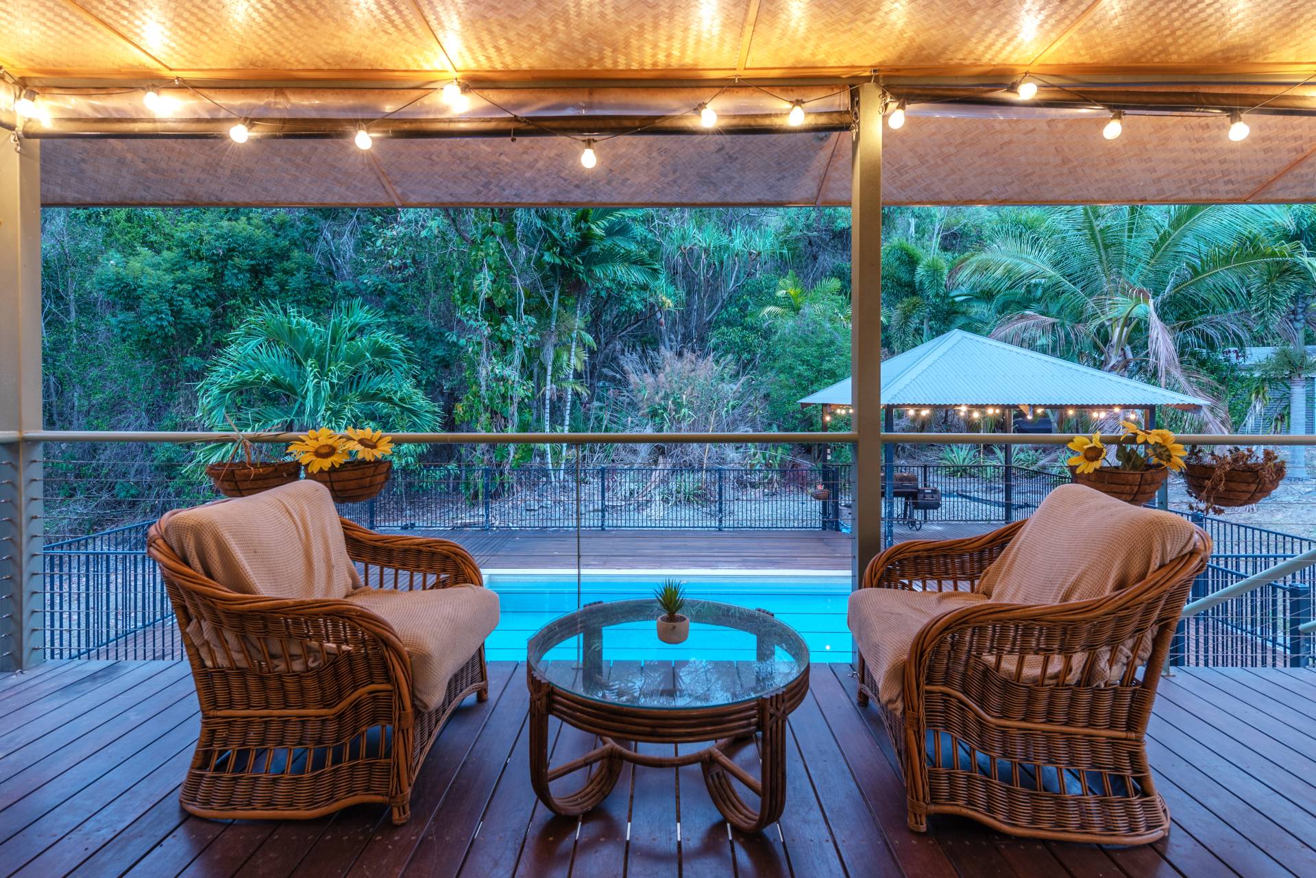 The pool, relaxation deck and BBQ pavilion area blends into the side of the gently sloping hill creating a mezzanine level that is easily accessed from both the up and down areas of the home.