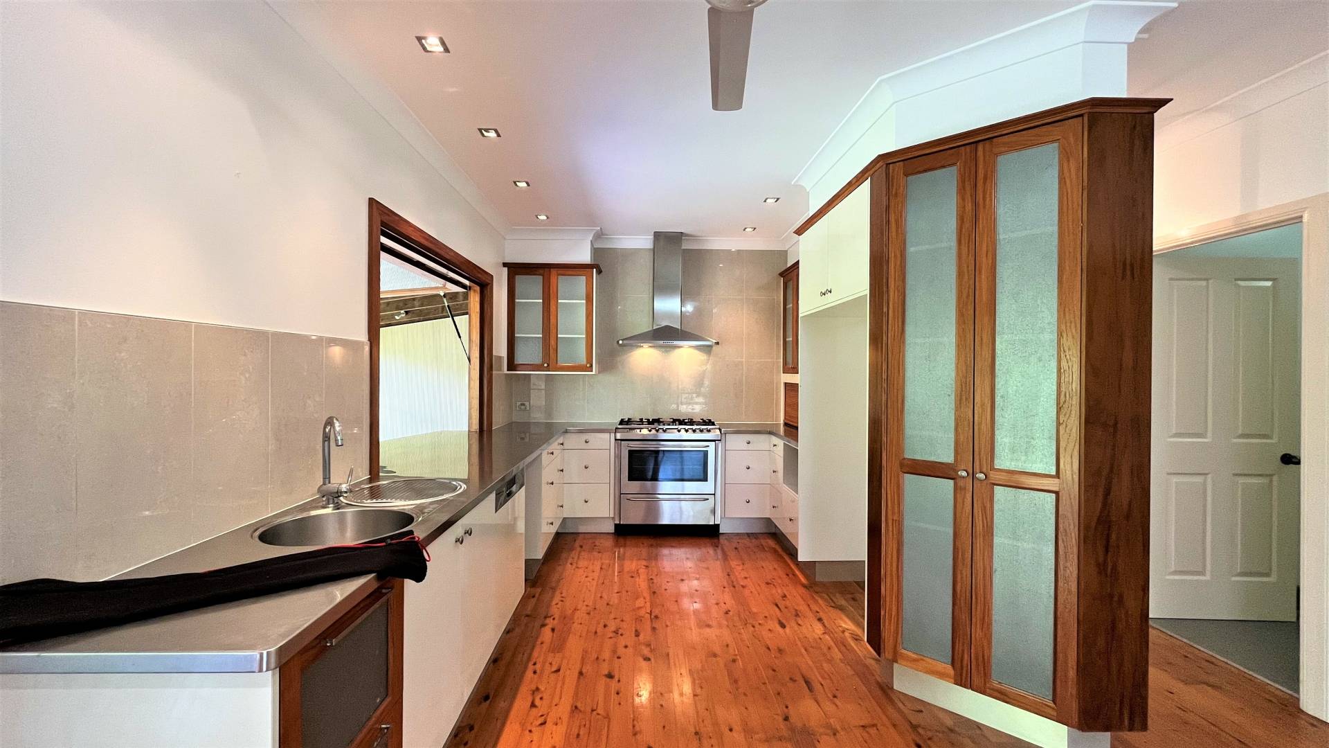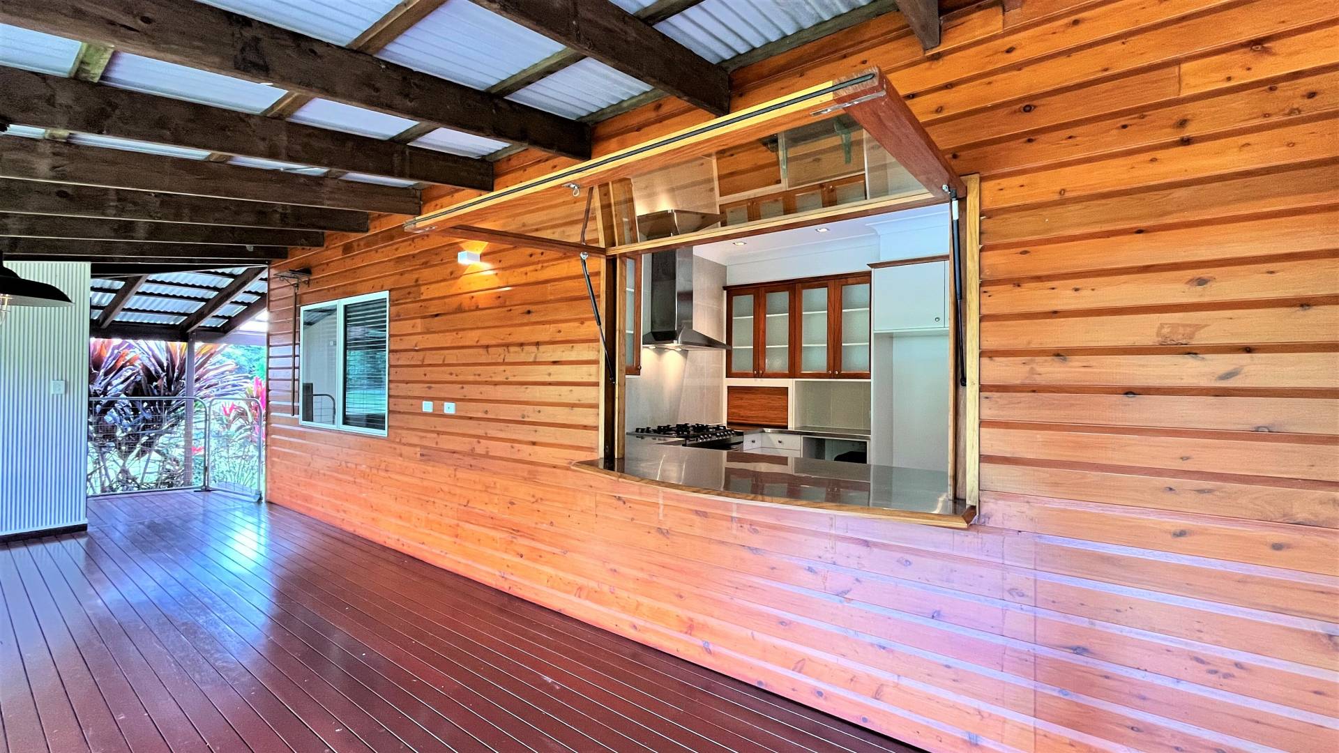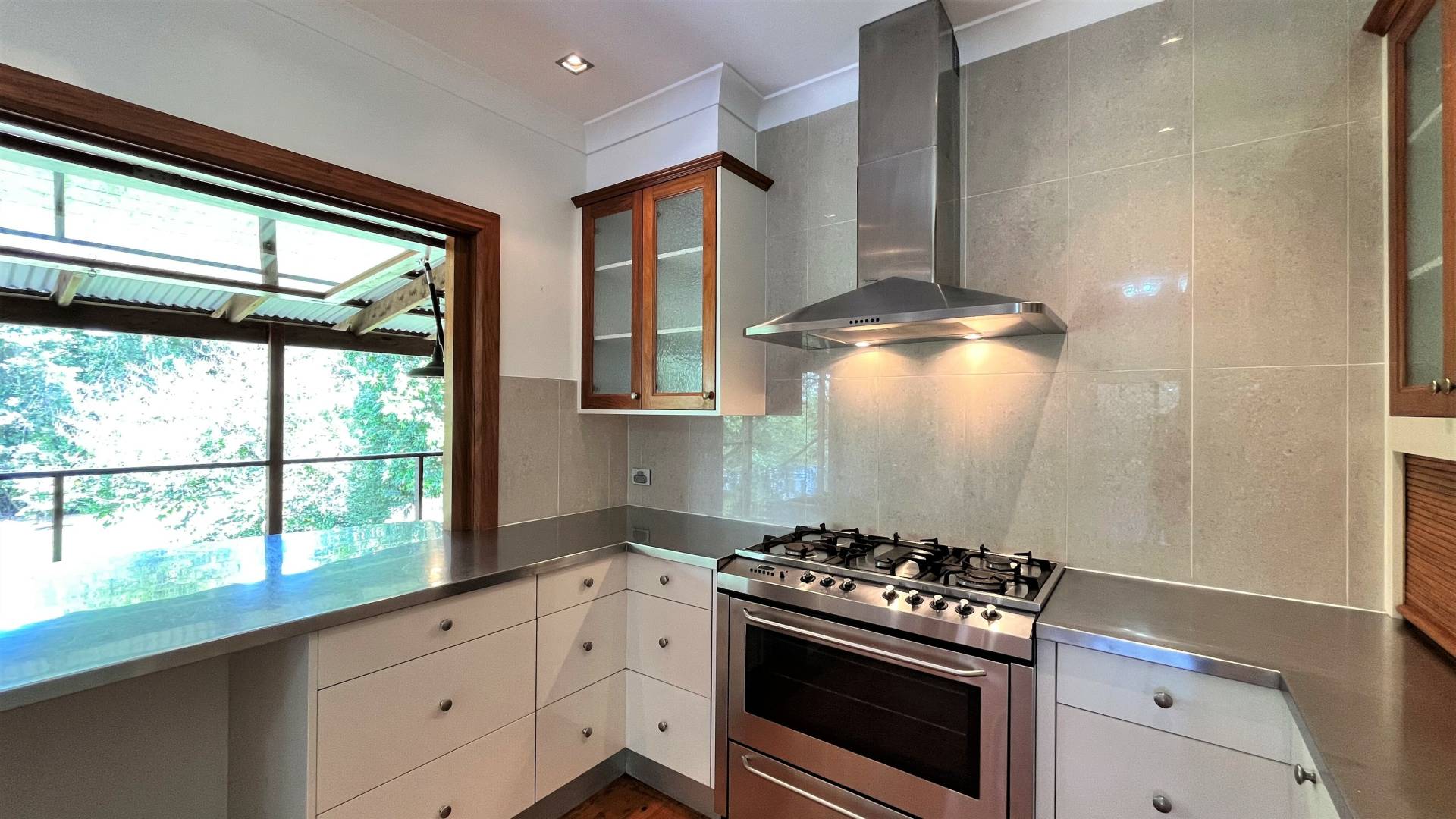 • Modern kitchen with free standing gas cooktop & electric oven, dishwasher, pantry & serving window to the deck.