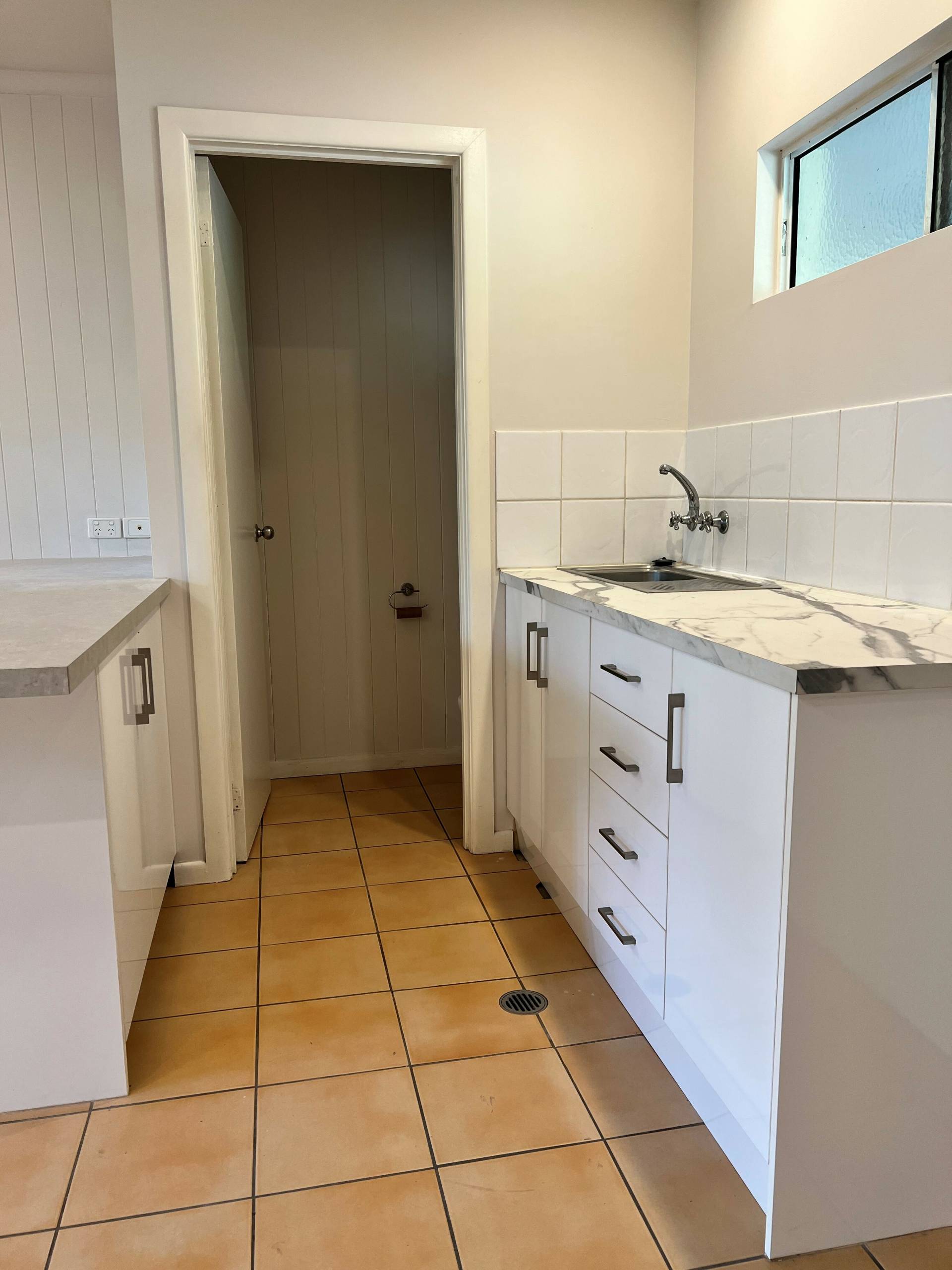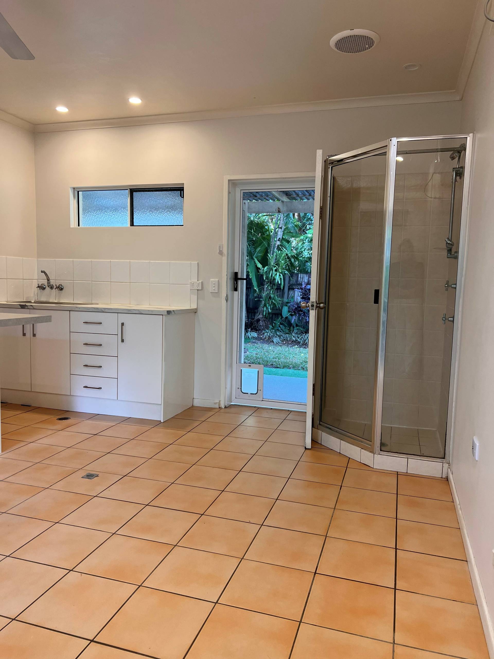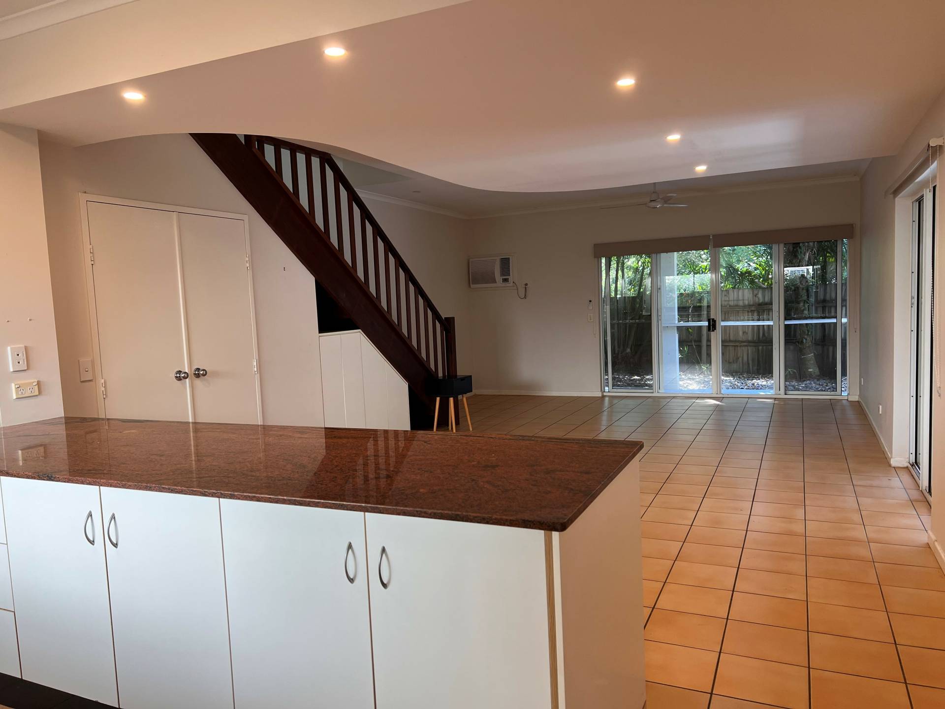 The main apartment features a large kitchen with granite benchtops flowing into the open-plan dining/lounge area.  From there, double glass sliding doors open out onto the back patio and yard with garden shed.