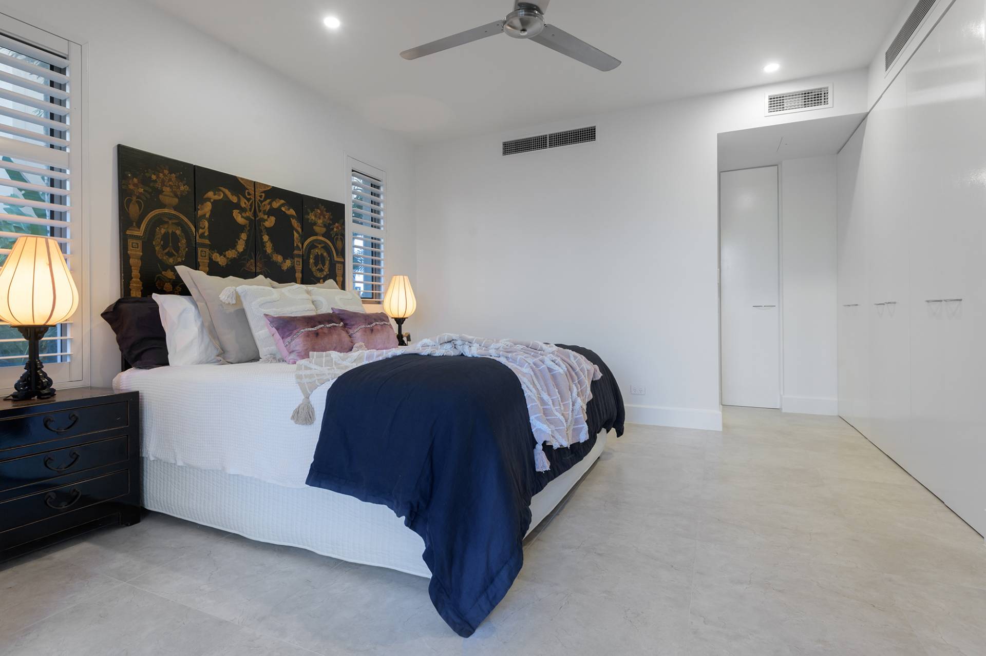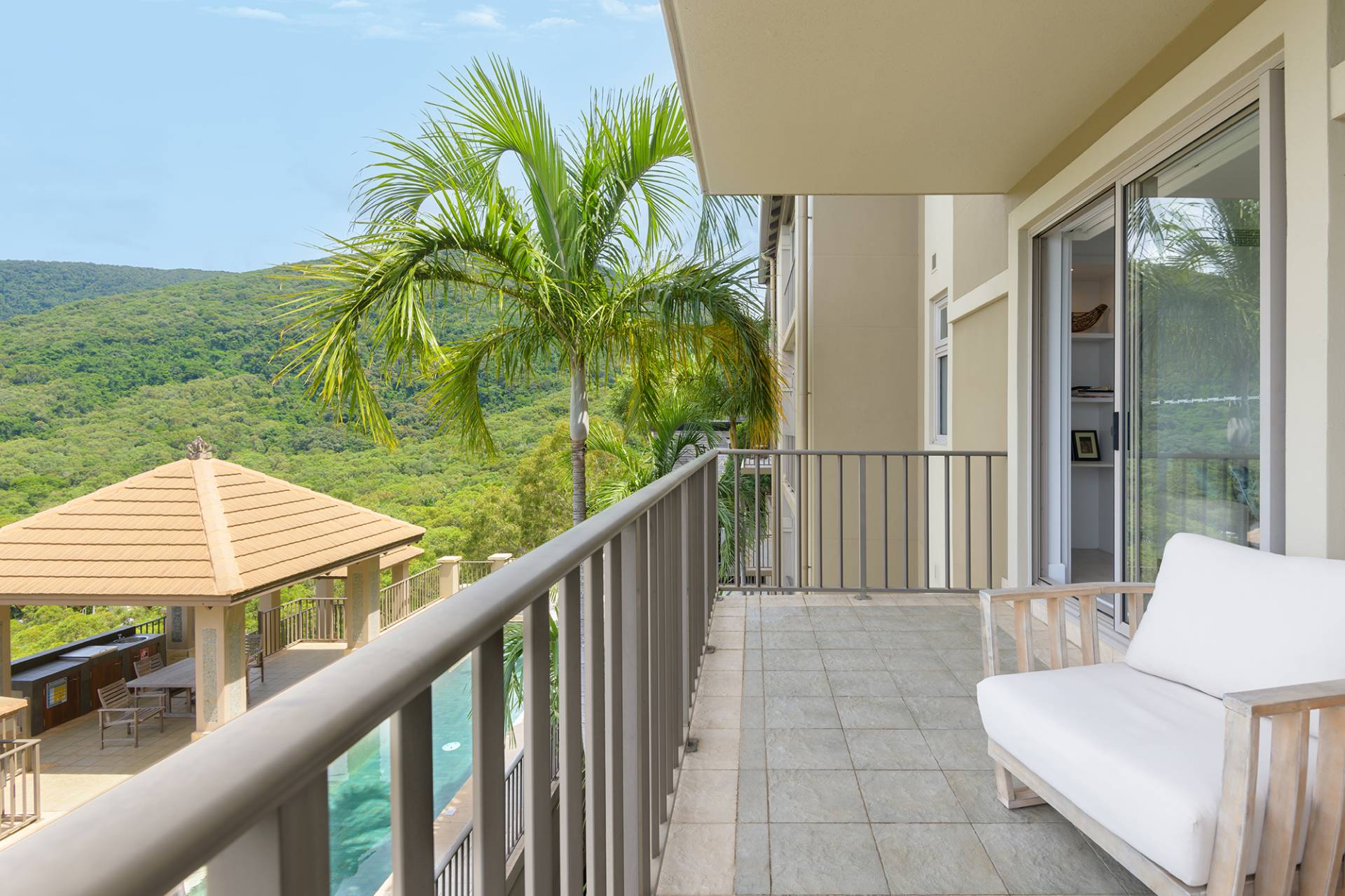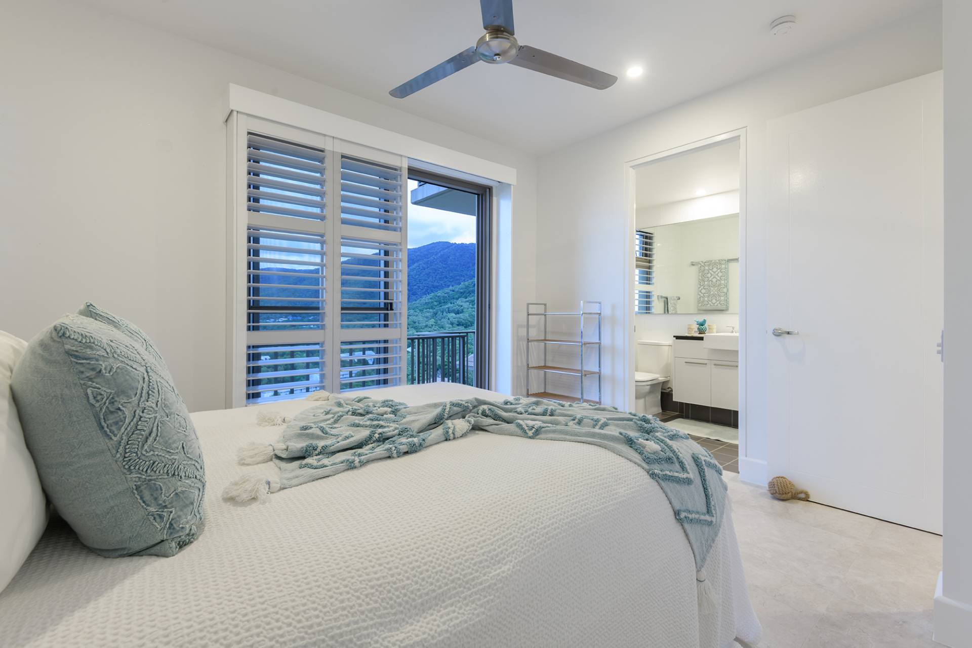 The guest suite including built-in robe, ensuite and access to the balcony, faces south overlooking the complex pool and BBQ pavilion, Palm Cove, and the beaches beyond.
