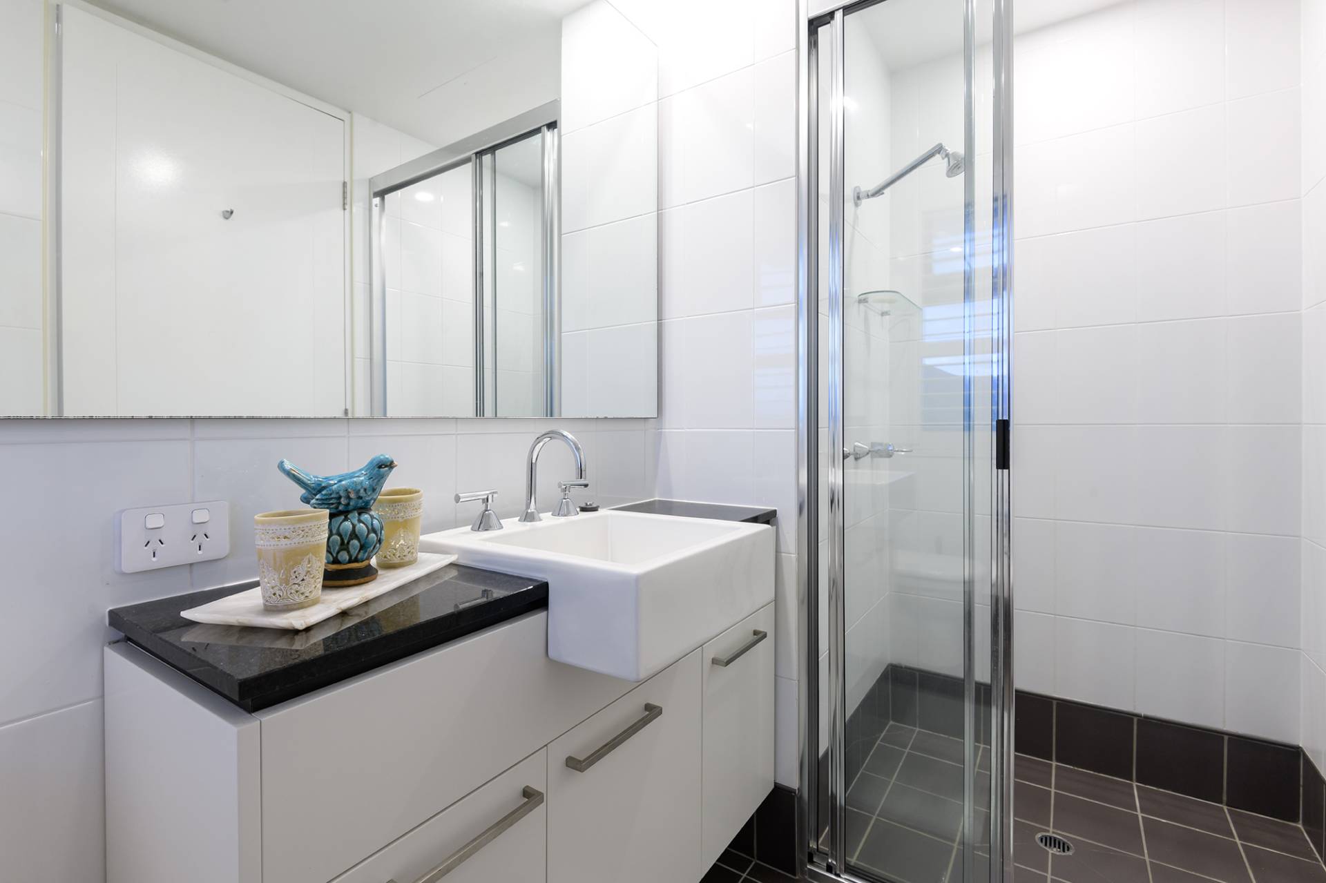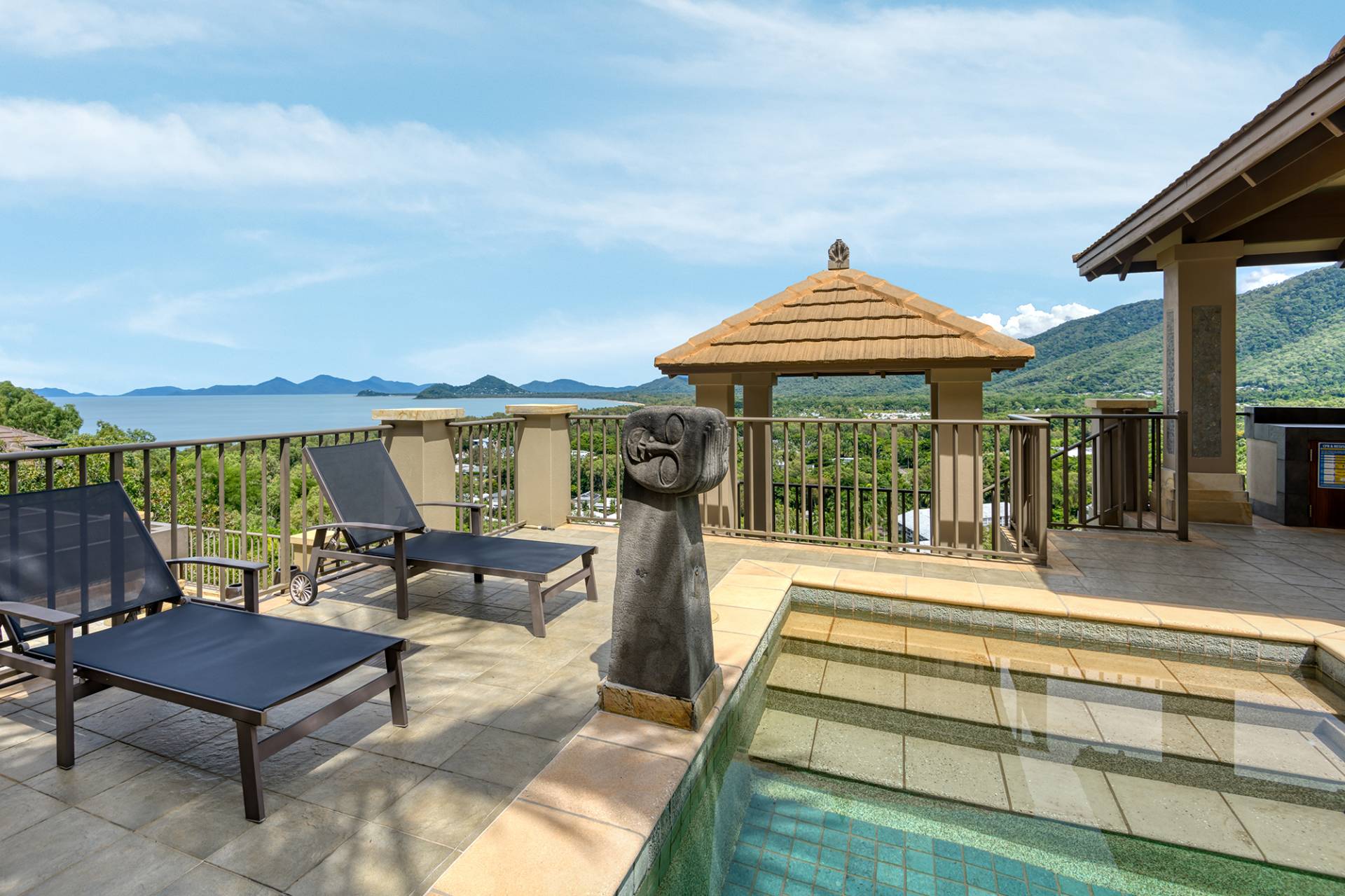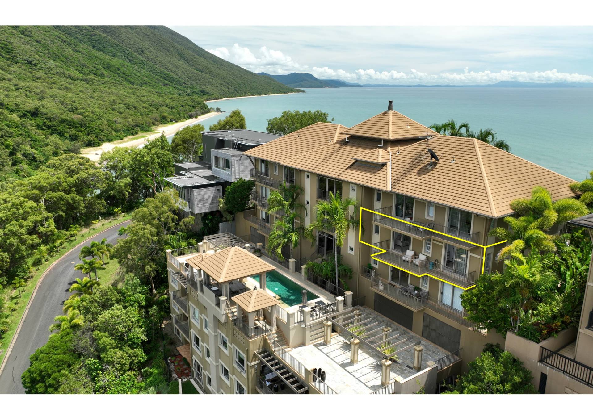 The guest suite including built-in robe, ensuite and access to the balcony, faces south overlooking the complex pool and BBQ pavilion, Palm Cove, and the beaches beyond.