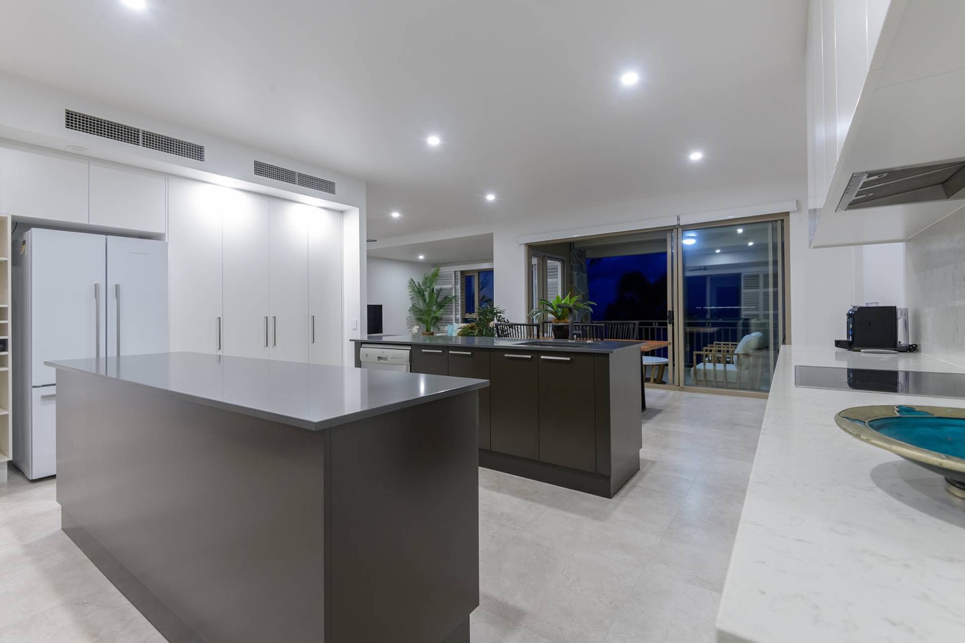 The modern, fully equipped kitchen is centrally located between the dining and another sitting room with views from both sides of the 2 large island benches.